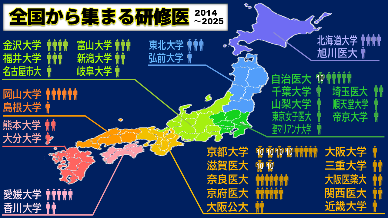 北は北海道、南は九州まで、津々浦々からたくさんの研修医が、研修を行っています。「大津赤十字病院で研修がしたい」という、やる気と熱意があれば出身大学は関係ありません。滋賀県に縁もゆかりもないのに、ホームページや動画を目にしたことをきっかけに、当院で研修医をして今もスタッフとして活躍している先輩も少なくありません。