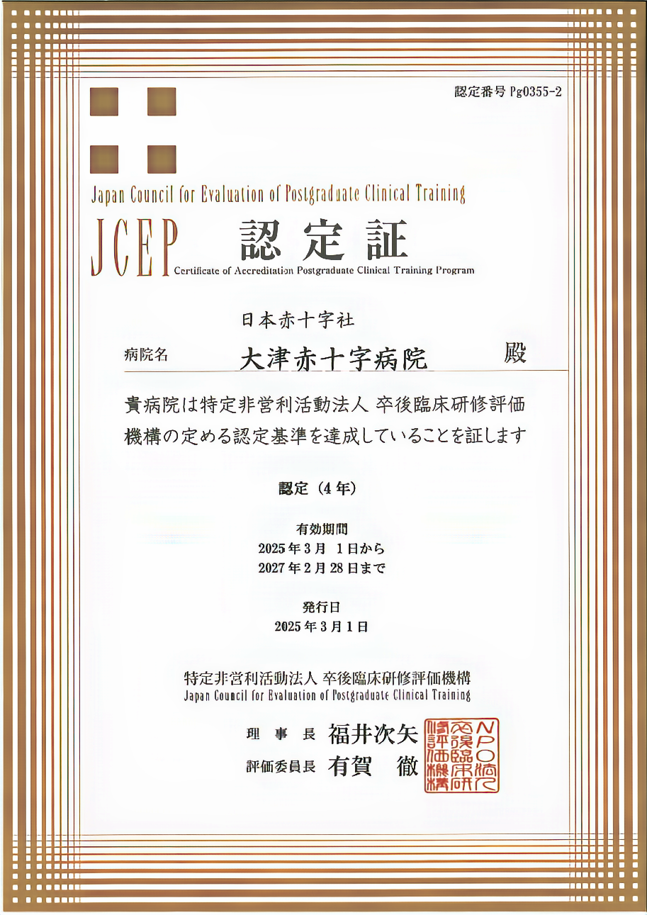 2025年1月24日にNPO法人 卒後臨床研修評価機構(JCEP)の第三者評価を受審し、機構の定める認定基準を達していることが認められ、2025年3月1日付で4年間の認定を取得しています。