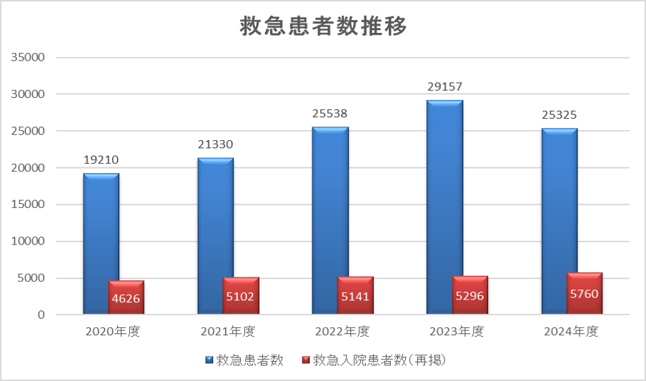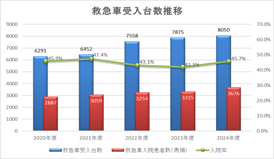 2024年度には、年間救急搬送台数は8,052台と8,000台を超え(応需率 99%)、滋賀県内のみならず近畿圏でも屈指の受け入れ実績を誇っています。入院患者数5,758人、総取扱患者数25,236人と、年々増加する救急需要に応え続けています。